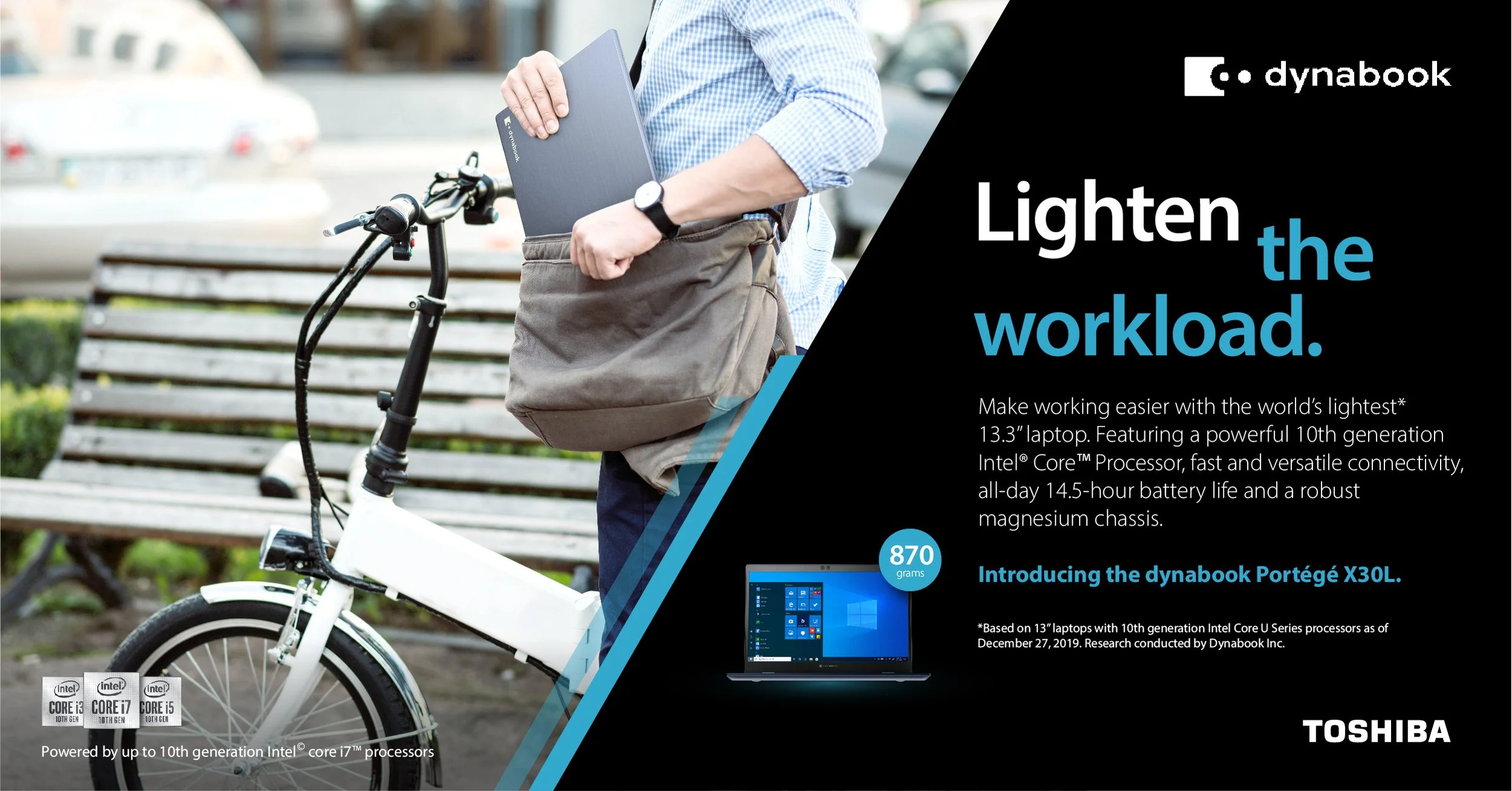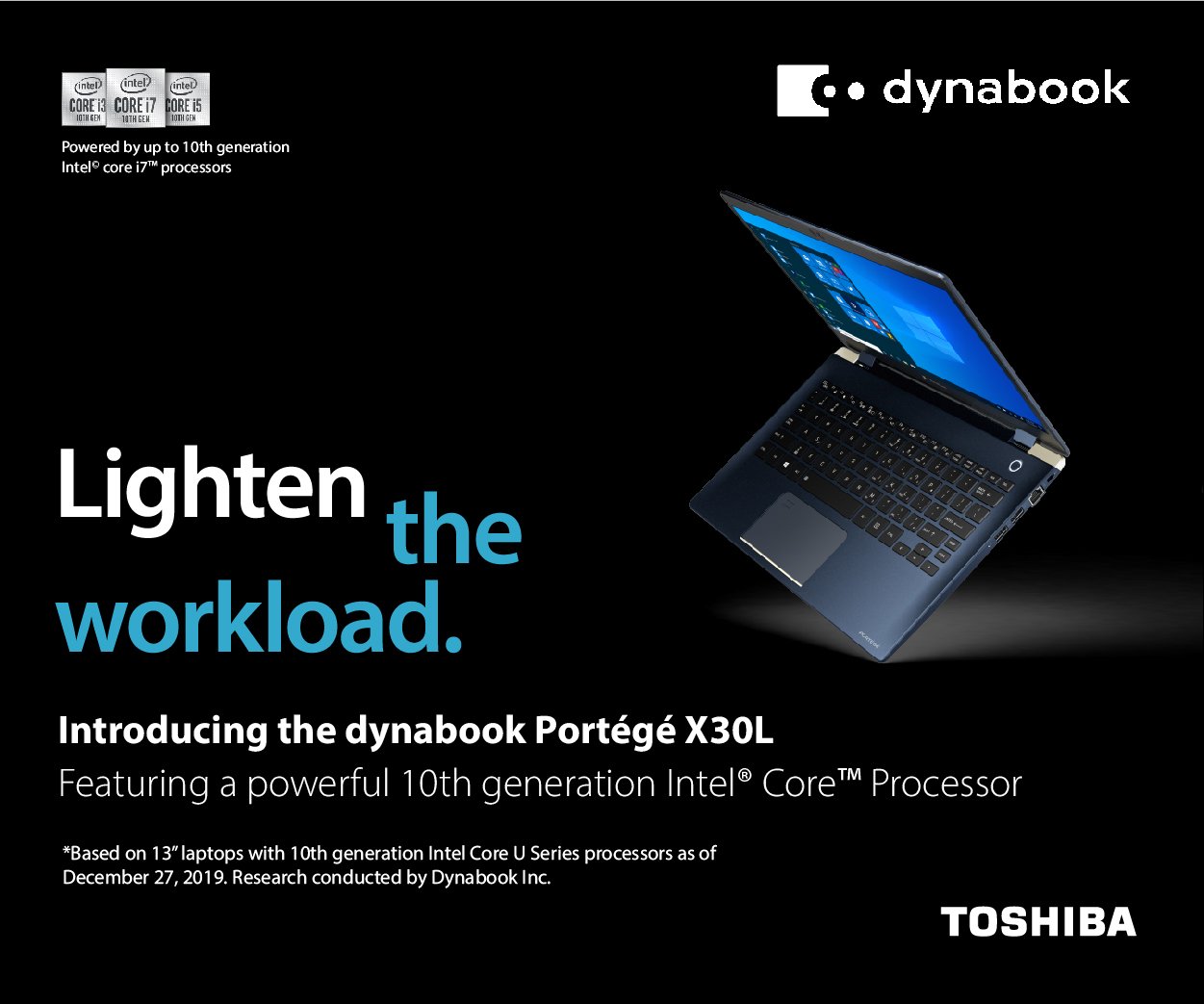 Dynbabook is a laptop manufacturer, formerly Toshiba Client Solutions Co., Ltd., We were approached to develop a creative campaign to advertise the new lightweight Portégé X30L-G laptop and create awareness for IT Managers and directors of the end-user benefits of the new product. The campaign also had to ensure translations work across multiple markets.